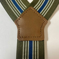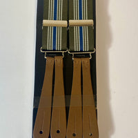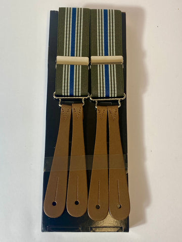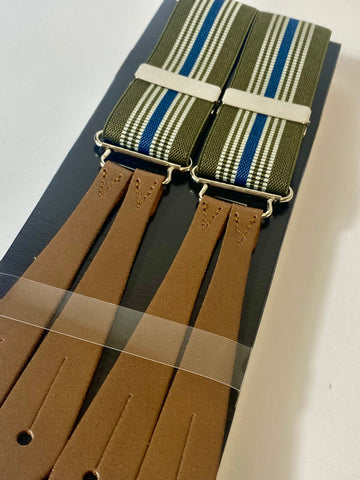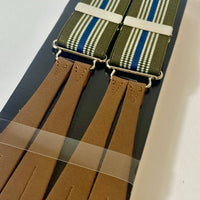 1940s pattern braces, UK bench made Y back leather ends in thick brown tan hide with silver clasps. Elastic in green, blue and white stripes. Fully adjustable to as long as 44” but designed for high waisted trousers.