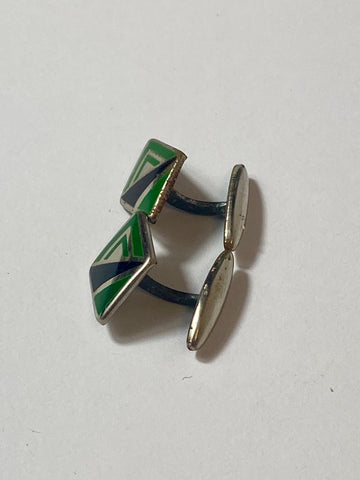 Art Deco cufflinks, enamel on gold metal in green and black with gold on square facing with bar link not chain. Deadstock never used.