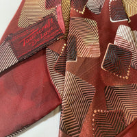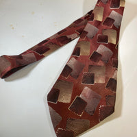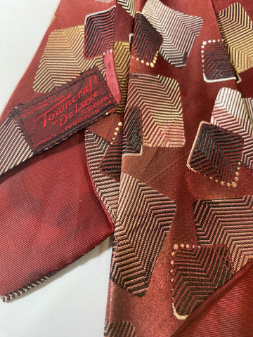 1940s brocade tie by town craft deluxe cravats in rust browns with geometric repeat pattern. Lined with open backs and short blade at 120cm long 10cm wide. No damage.