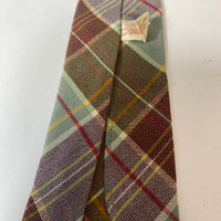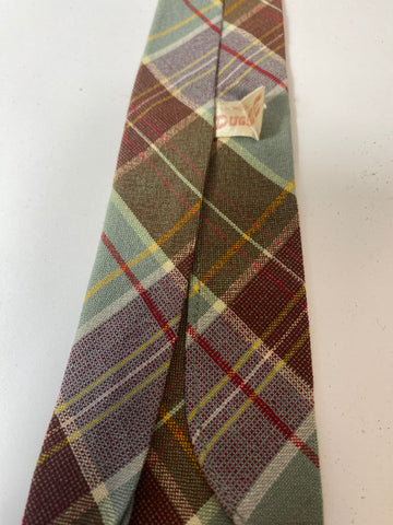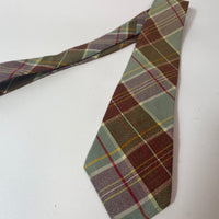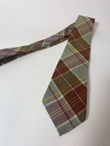 1940s Duggie tie all wool in green brown and red plaid pattern. No lining and open backs with short blade at 120cm long 8cm wide. No damage.