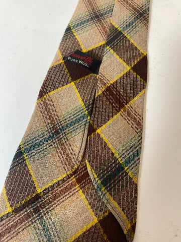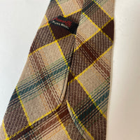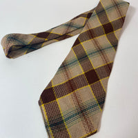 1940s Grenville tie in fawn brown green and yellow plaid pattern. No lining and open backs with short blade at 120cm long and 9cm wide. No damage.