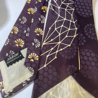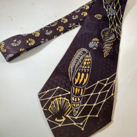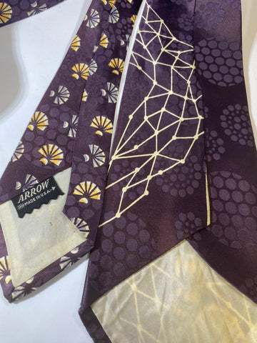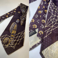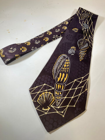 1940s swing tie in dark purple with shell and abstract grid design in white and yellow. Arrow label, lined with open backs and short blade at 129cm and 10cm wide. No damage.