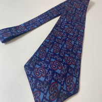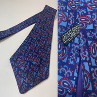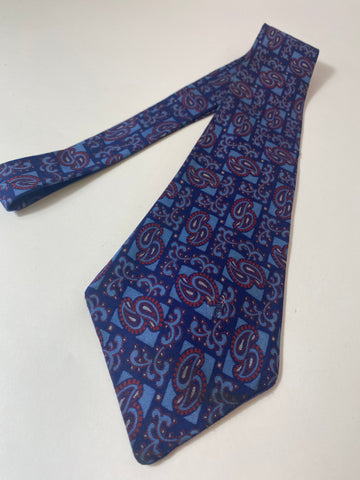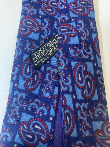 1940s Tootal tie special quality label in two tone blue with maroon paisley, geometric pattern. Open backs and short blade at 124cm long and 10cm wide. No damage.