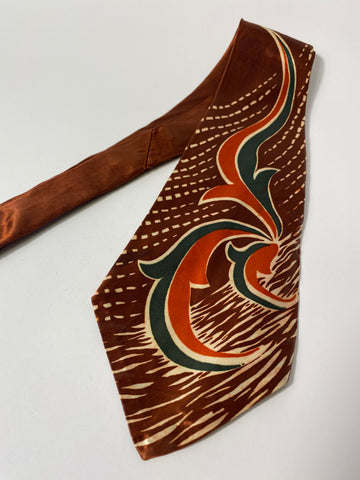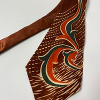 1940s US swing tie in red clay brown with orange, green and white abstract pattern. Open backs and short blade at 123cm long 11cm wide. No damage.