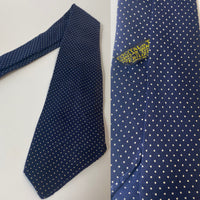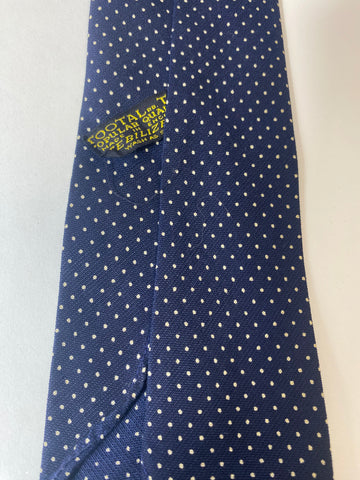 1940s Tootal tie yellow quality label. Blue with white spots. No lining, open backs and short blade at 120cm long 9cm wide. No damage.